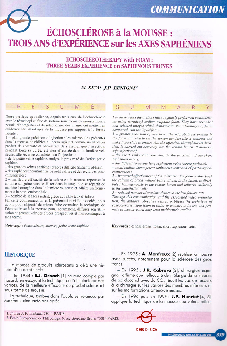 Le Dr Mario SICA a été un des premiers auteurs à publier sur la sclérothérapie échoguidée par mousse en France (première présentation en 1999 dans le cadre du congrès annuel de la société française de phlébologie).